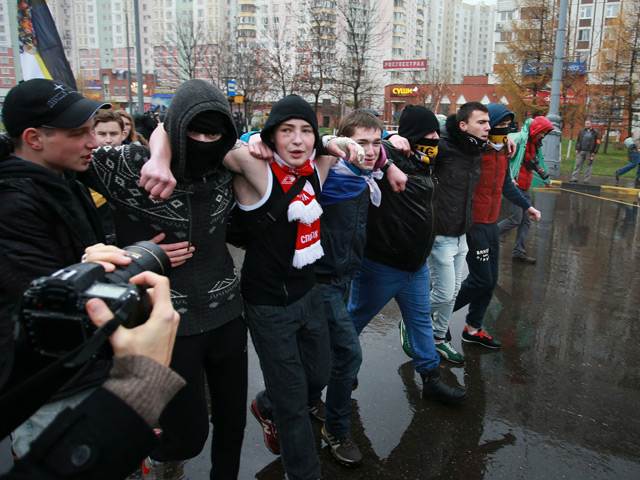 Некоторые из собравшихся были одеты в черные маски-"балаклавы", а также в черные куртки и брюки. Молодые люди развернули транспаранты с лозунгами: "Русские, объединяйтесь!". Другие несли флаги футбольных фанатских организаций, в том числе с символикой клуба "Спартак".