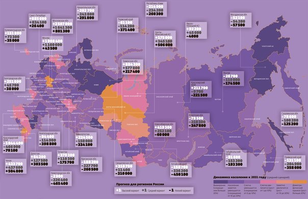 Диаметрально противоположный прогноз — демографический прыжок с ростом населения более 20 процентов предсказан лишь трем регионам: Москве, Ханты-Мансийскому автономному Округу и Чеченской республике.