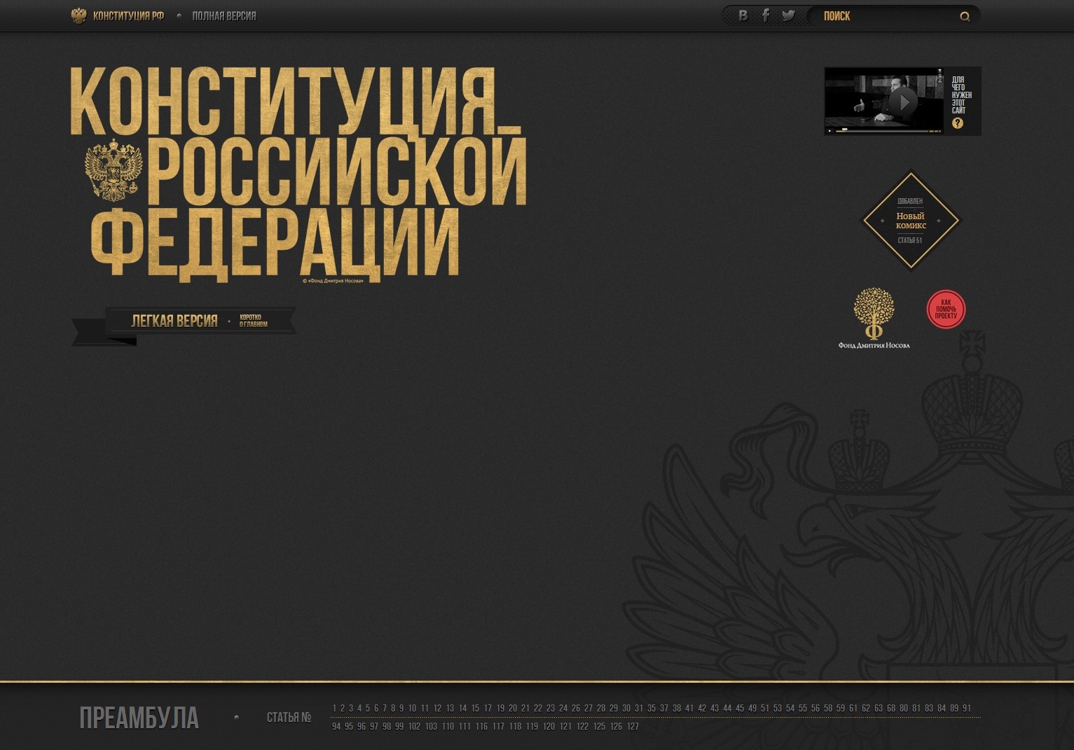 Сайт представляет собой визуализизованную Конституцию Российской Федерации, с удобной навигацией по статьям, ссылками на главные понятия и картинками-комиксами. Подобное представление Документа способствует лучшему запоминанию, им могут пользоваться как дети, так и взрослые. Как считает Дмитрий Носов, изучение Конституции обязательно для всех и в первую очередь для тех, кто отвечает за соблюдение этих прав. Без знаний основ невозможно воспитание поколения, здорового физически и нравственного.