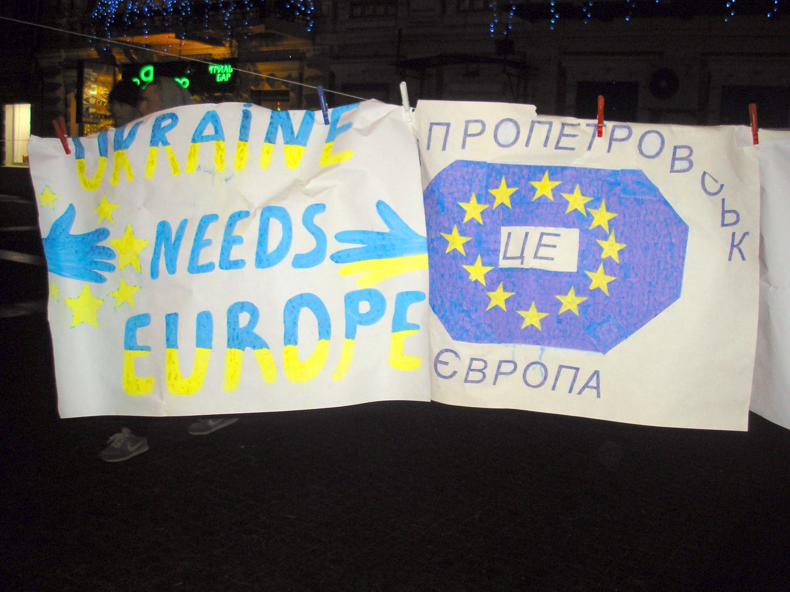 Несмотря на достаточно прохладную погоду, украинцы практически со всех регионов страны прибывают на Евромайдан, и эта акция уже стала общегражданским протестом. Народ греется у костров, разведенных в железных бочках, слушает музыку и общается. Время от времени они скандируют “Слава Украине!”, “Украина – это Европа”.