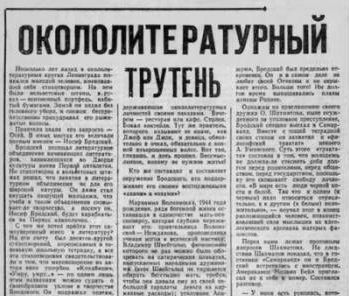 50 лет назад, 29 ноября 1963 года, в газете «Вечерний Ленинград» появился фельетон-донос «Окололитературный трутень» о будущем нобелевском лауреате Иосифе Бродском. Начинался он так: «Несколько лет назад в окололитературных кругах Ленинграда появился молодой человек, именовавший себя стихотворцем. На нем были вельветовые штаны, в руках — неизменный портфель, набитый бумагами. Зимой он ходил без головного убора, и снежок беспрепятственно припудривал его рыжеватые волосы». Характерно, что в фельетоне цитировались стихи, к которым Бродский не имел никакого отношения.