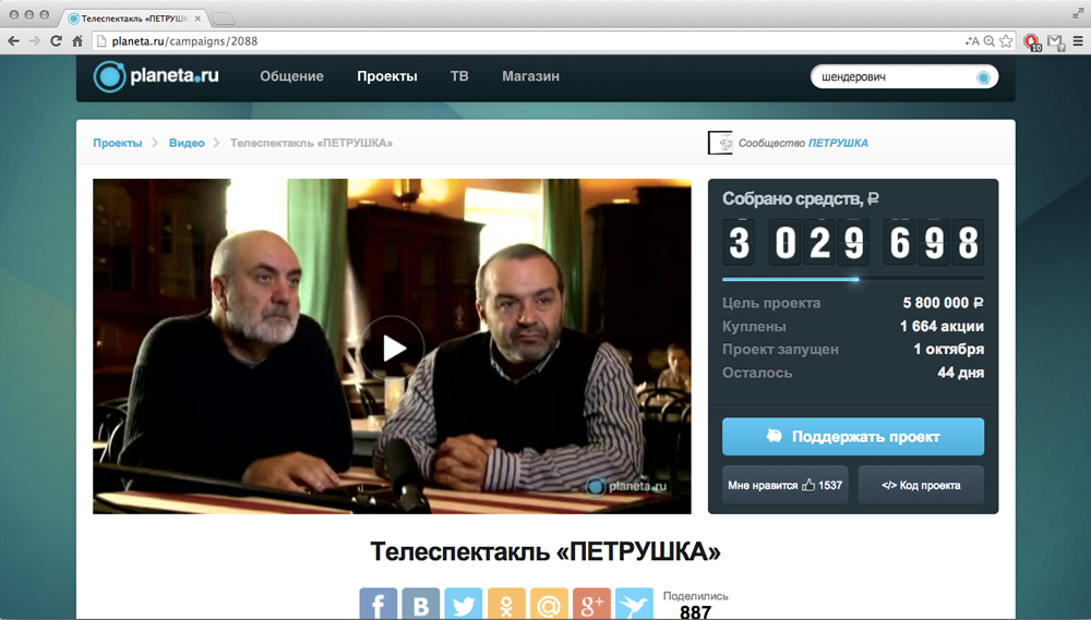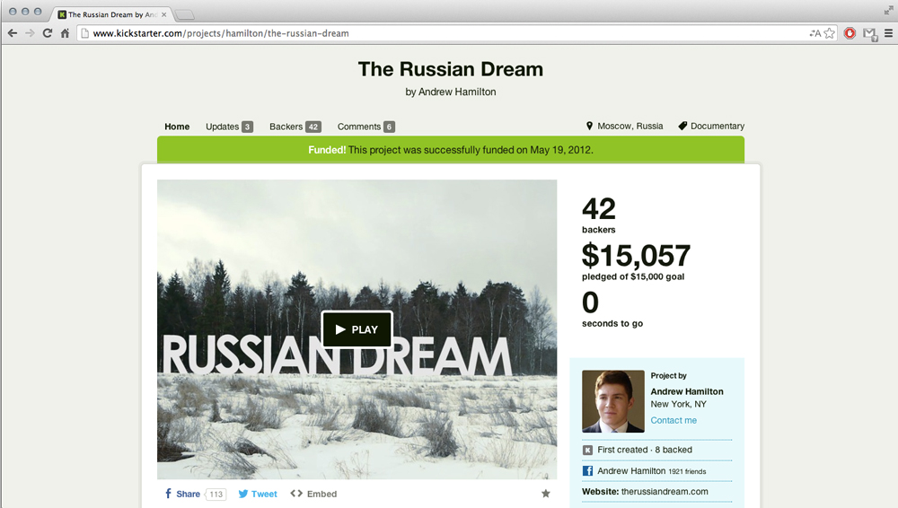 Понятное дело, в России представлены не все формы краудфандинга: до принятия законов, которые бы легализовали у нас краудлендинг или краудинвестинг, ждать придется долго. Крайне мало шансов, что когда-нибудь в наши края придет Kickstarter: его стратегия расширения весьма консервативна, до сентября нынешнего года он был представлен лишь в США и Великобритании. Но свято место пусто не бывает: помимо упомянутого выше сервиса kroogi.com в России действуют площадки Planeta.Ru и Boomstarter. Последний очень строго воспроизводит правила американского флагмана: проект, собравший меньше 100% от заявленного финансирования, денег не получает. Есть ограничения по типу проектов, которые могут претендовать на поддержку (не допускается, например, благотворительность). На Planeta.Ru правила помягче: порог составляет половину заявленной суммы, и ограничений по участию благотворителей нет. За первый год работы Planeta.Ru собрала для своих подопечных 35 млн рублей, Boomstarter — 25 млн. По сравнению с $896 млн, которые к этой минуте собрал Kickstarter, это, конечно, не впечатляющие цифры. Но у российских площадок всё впереди. Уже сегодня сборами на Planeta.Ru Виктору Шендеровичу и Владимиру Мирзоеву удалось привлечь больше 3 млн рублей на телеспектакль «Петрушка». Интернет-издание Colta.Ru, потерявшее за недолгую свою историю двух инвесторов по не зависящим от редакции обстоятельствам, сумело через Planeta.Ru наладить финансирование выпуска на деньги читателей. На Boomstarter тем временем поставлен абсолютный к сегодняшнему дню российский рекорд по привлечению народных денег на съемку художественного фильма: историческая кинолента «28 панфиловцев» собрала 3,2 млн рублей…