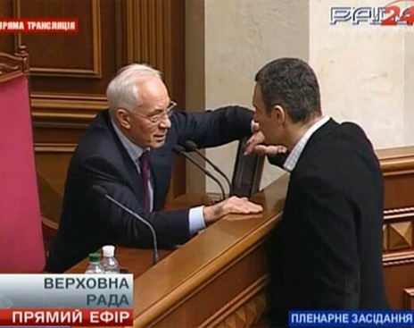 Сегодня на заседании Верховной рады Украины Виталий Кличко, лидер фракции УДАР, о чем-то горячо заспорил с премьером Николаем Азаровым, показывая на него пальцем. Видимо, эмоции были нешуточные, потому что в какой-то момент председатель правительства схватил боксера и депутата за кулак.