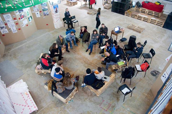 © Таня Сушенкова Ассамблея на фестивале «Медиаудар» Рабочая группа второго «Медиаудара» сама стала отголоском движения Occupy, поместив ассамблею в центр процесса организации. Фестиваль был придуман на ассамблеях. Ассамблеи продолжались и после открытия, мы указывали время их проведения в расписании и располагались в самой заметной части пространства. Так организационный процесс стал частично открыт и для визитеров. Одним из важных опытов для меня стала ассамблея, прошедшая спустя неделю после открытия. На ней мы ставили под вопрос и уточняли основные принципы организации фестиваля и наши ожидания от участия в нем. И в этом процессе участвовали посетители. Однако на пути от институций к новым учреждениям возникли и новые проблемы. Начав дрейф самоорганизации и отказавшись от фигуры куратора и исполняемых им функций, мы не смогли в достаточной степени заполнить пустующее место координации горизонтальными связями.