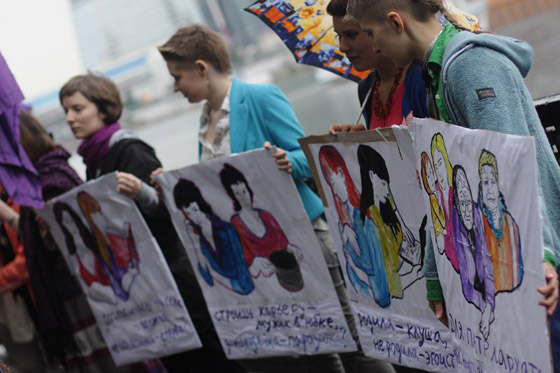 Марш Равенства, лето 2012 В череде этих путешествий социальной графики остановка в галерее выглядит вполне логичным и необходимым, но не окончательным шагом. Множество трактовок, вариации с масштабами, постоянное участие в прямом действии все больше отделяют принт от оригинала, наполняя его самостоятельным содержанием. Это и подтолкнуло нас к идее организовывать «ФК» в формате передвижной феминистской выставки, полностью собранной из принтов, трафаретов и бумажных стикеров, которую можно в условиях минимального финансирования распечатать и смонтировать в любой точке мира вместе с сопроводительными текстами.