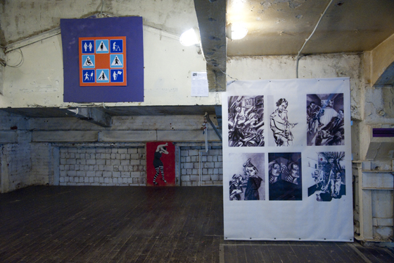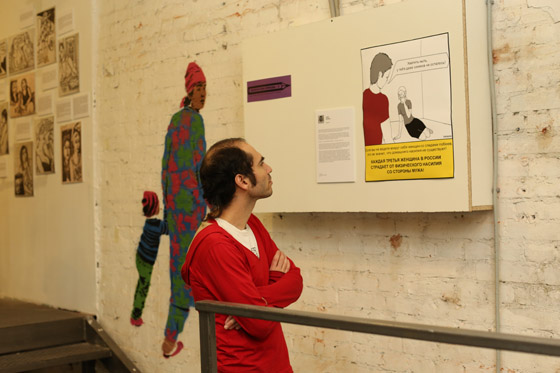 © Ольга Ахметьева Плакаты Анны Репиной о семейном насилии Вместе с тем понятно, что ограниченность наших ресурсов делала невозможным полный сепаратизм. Получить достаточно крупный зал, который бы вместил всю выставку, нам помог коллективный фестиваль активистского искусства «Медиаудар», в рамках которого и состоялся второй «Феминистский карандаш». При этом помещение (малый зал Artplay) четко разделилось надвое: наша выставка располагалась на втором этаже, основная программа «Медиаудара» была на первом. В отличие от «ФК-2», эта основная экспозиция была организована скорее как фон для мероприятий, чем как цельная выставка с единым планом развески и концептуальным решением.