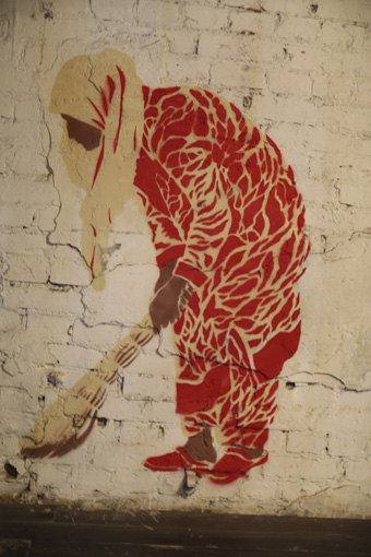 «Фреска» создала несколько новый контекст для городских трафаретов, которые составили вместе с ней что-то вроде монументального сектора экспозиции. Одной из самых цитируемых работ с «ФК-2» стали большие, в человеческий рост, трафареты группы Gandhi (Омск — Петербург) с узбекскими женщинами, занятыми повседневной работой, — «Кунсана, Нисо, Айсулу и Наргиз». Если эти яркие цветные фигуры были намеренно поставлены на уровне глаз зрителя и таким образом становились свидетельницами и участницами живого пространства выставки, то другой крупный трафарет — черно-белая вещь Микаэлы «Девочка должна слушаться» — был, наоборот, вынесен в символическое пространство и приподнят над публикой, как знамя или лозунг. Действительно, этот сюжет можно считать итогом выставки, суммирующим реакции критиков: темный массив многоглавой семьи с неодобрением и сарказмом вглядывается в фигуру «маленькой девочки».