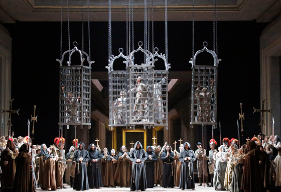 Постановочную команду возглавил британский режиссер Эдриан Ноубл, много лет руководивший Королевским Шекспировским театром, но и в опере тоже работавший. Вместе со сценографом Тобиасом Хохайзелем, художником по костюмам Морицем Юнге и художником по свету Жаном Кальманом они сделали костюмный спектакль про музейную Испанию XVI века с условным Эскориалом, многозначительно присыпанным снегом, картонными позами, темный, скучный и статичный даже в сцене шествия Великого инквизитора, над которой оперные режиссеры в наше время как только не упражняются. «Каждый священник — палач, каждый солдат — разбойник! Народ стенает и молча гибнет. Ваша империя — бескрайняя, ужасная пустыня» — высвечиваются в титрах над сценой обвинения Родриго в адрес испанского короля Филиппа II, некогда, вероятно, чрезвычайно резкие. Но ничто не корябает сердца зрителей Большого театра.