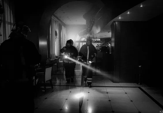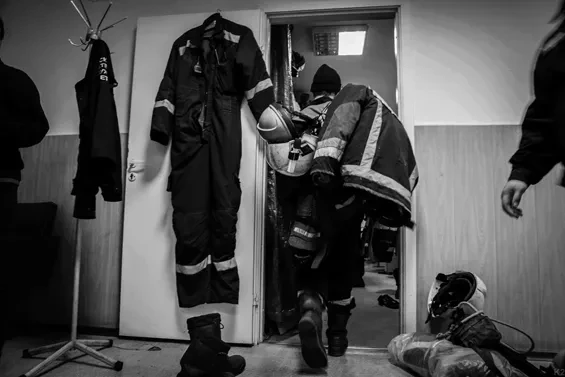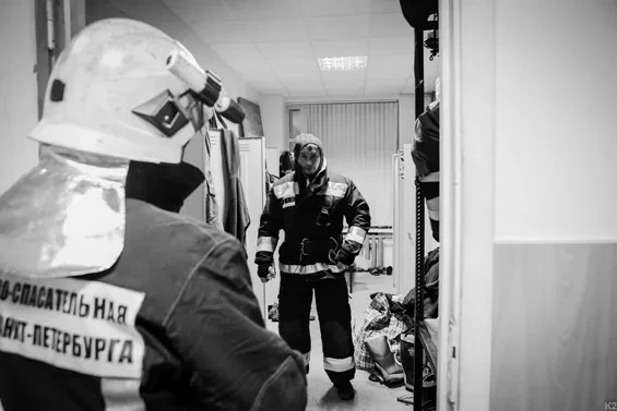 Знакомство с караулом прерывает резкий голос диспетчера из динамика: «Дежурная смена, на выезд!». Секунда — исчезают ирония и смех, все бросаются в раздевалку за боевками. Через минуту перед глазами встречная полоса, блики мигалки и режущий слух вой сирен — наших.
