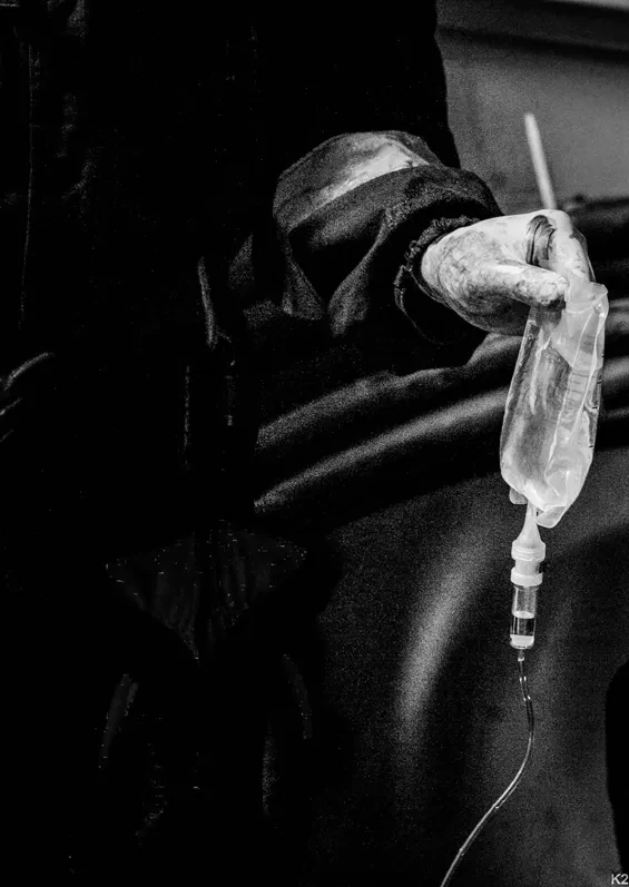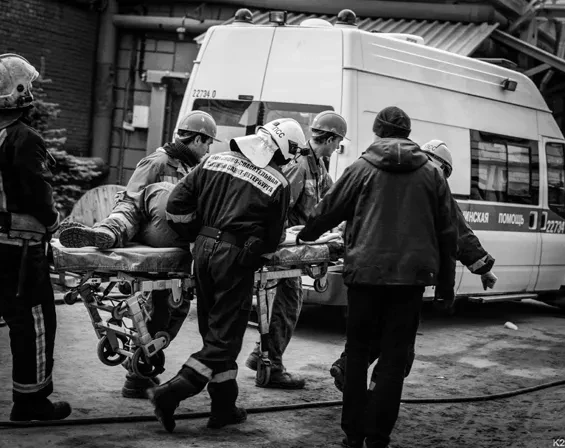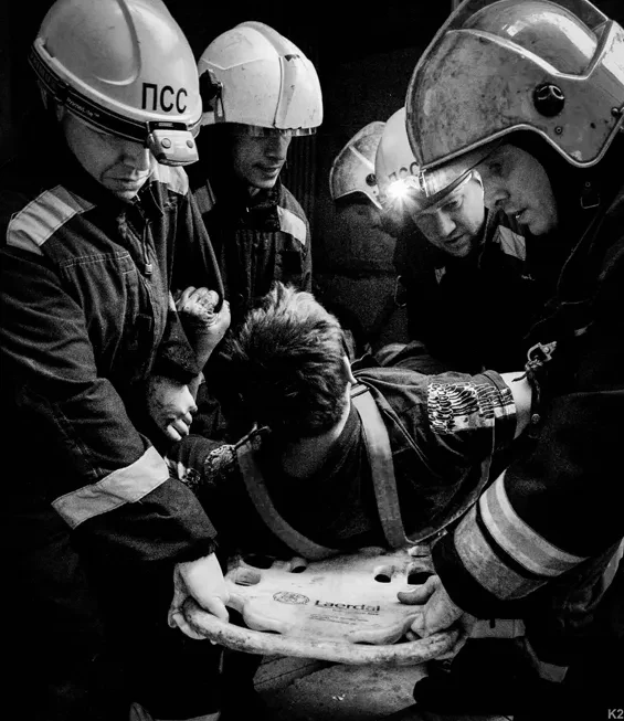 Выносят второго, он слегка улыбается глядя на друзей строителей, которые окружили носилки. Третий — самый сложный. Открытые переломы. Капельницу с обезболивающим ставят прямо в шахте. В то время, когда врачи пытаются остановить кровотечение, один из спасателей держит окровавленными руками пакет с лекарством.