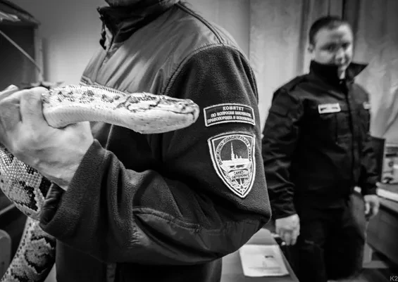 Спасатель Станислав с дружелюбной улыбкой протягивает мне трехметрового шипящего питона:
