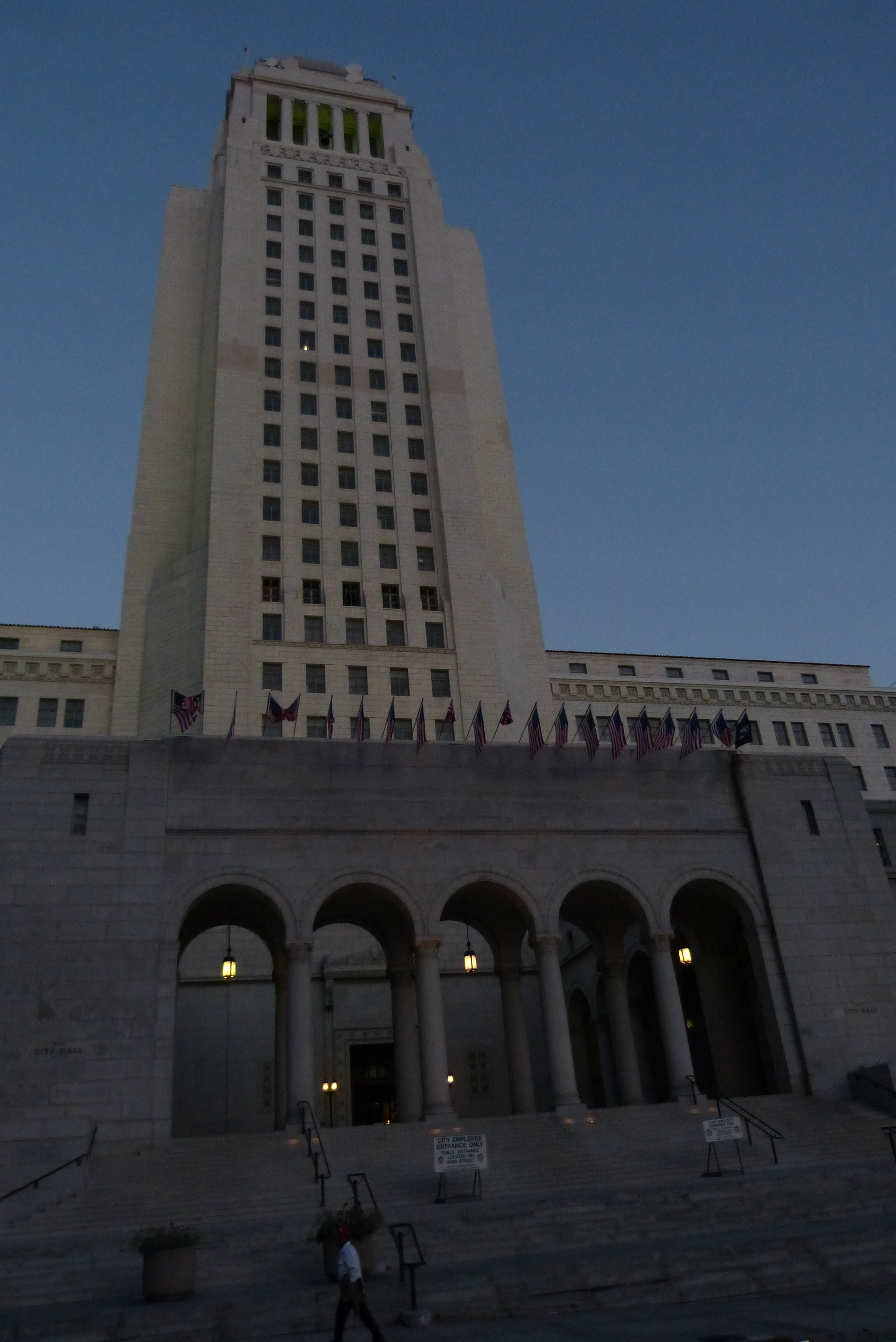 Лос-Анджелес состоит из ряда маленьких городков, раскиданных на приличном расстоянии друг от друга: Санта-Барбара, Беверли-Хиллс, Голливуд, Санта-Моника, Лонг-Бич. И при этом сохраняется некий обобщающий дух, завязывается узел, собирается комок. Шарм этого места, этого ареала довольно быстро подчиняет и очаровывает. Это город, единый, как тело, вписанный в круг окрестных холмов как знаменитый образ Золотого сечения Леонардо, руки и ноги врозь в моносимметрии. Даунтаун опять торчит издалека выше всех, группой разноформных небоскребов. Мэрия как несуразно-помпезный монумент из проектов Эль Лисицкого 20-х, с флагами и лестницей в облака. Улицы пустые. Видны только клошары. Абсурдно и сюрреалистично.