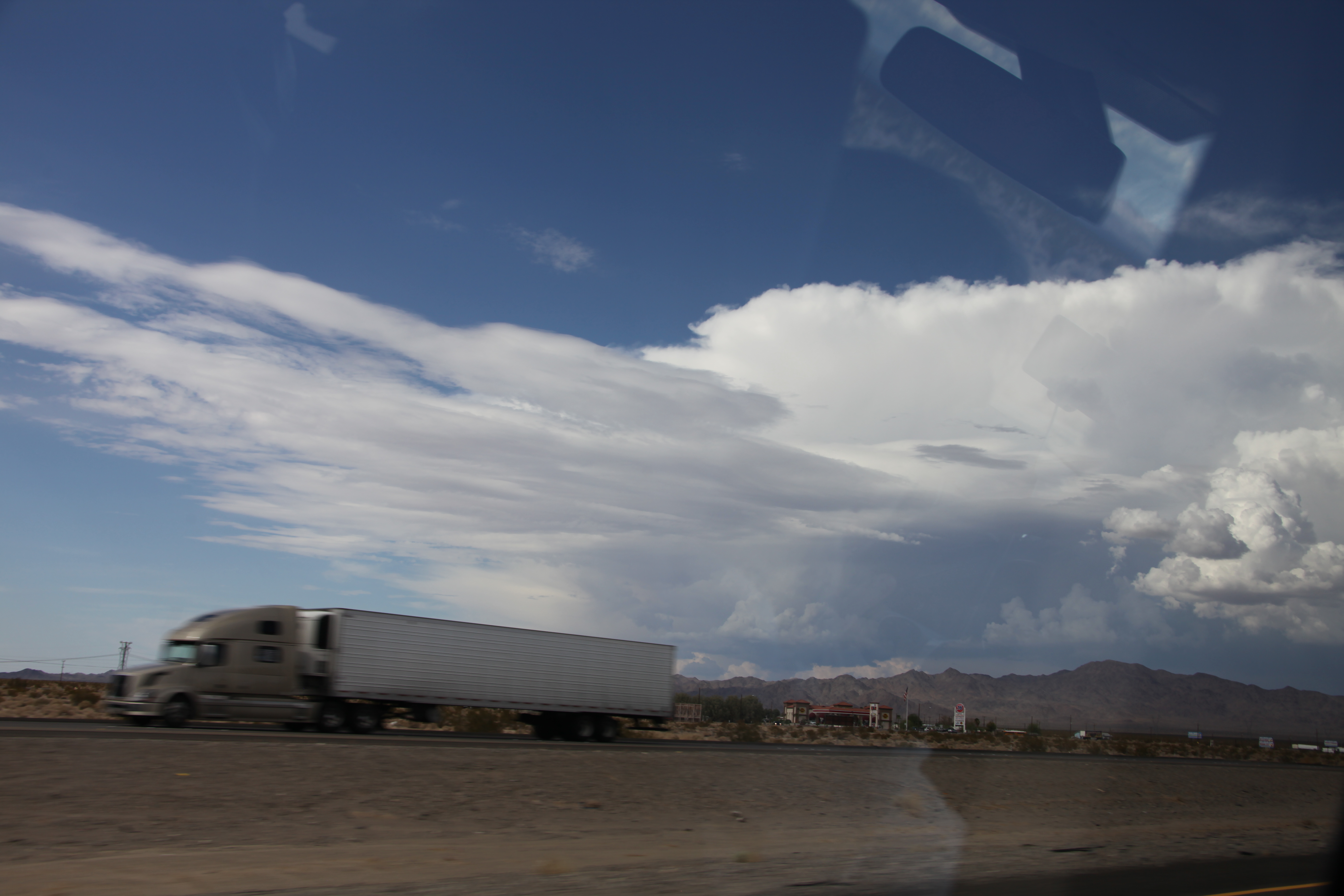 Пустыня Мохаве. Представлялась пустынная дорога, в одну полосу туда, в одну обратно. По кино, естественно. Про убийцу-маньяка, например. И никого вокруг. Хелп!!! Хелп!!! Но в реальности шли в потоке. Роскошные дальнобойные грузовики, каждый как личность. Самые красивые механические животные на дорогах Америки. Длинные составы вагонов с паровозом, тоннели, мосты, коробки простейших жилищ кажутся музейными экспонатами кукольных габаритов. Столь грандиозен масштаб пейзажа, где облака и горы – главные составляющие, а все остальное лишь уточняющий орнамент, мелкая вязь подробностей. Деревья-кактусы. Перекати-поле на обочинах пучками.