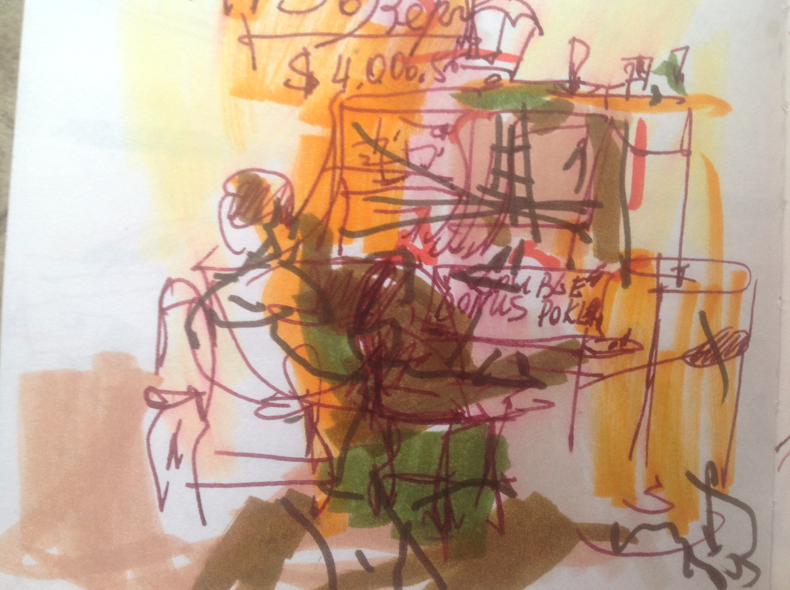 Лас-Вегас стартовал в начале 1930-х, и стилистика дизайна игральных автоматов соответствует тому времени. Мертвый воздух застревает в носу. Порисовать в блокноте – будто веером прикрыть лицо. Можно безнаказанно разглядывать людей, ходить между играющими, не вызывая раздражения и беспокойства секьюрити, которые здесь как коршуны. Остановившиеся глаза, зажатые под мышкой сумочки у старых дам, как клонированные, все на одно лицо, бычки в зубах и у девушек, и у стариков, среди крупье много восточных женщин. А начинали как игроки. Я помню их по Берлину. Две стриптизерши на длинном столе, кассы с решеткой для выдачи бабок. Где по-крупному, там спины вокруг. Слава богу! Завтра вон!