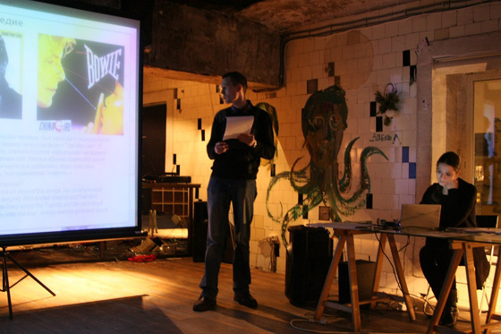 © Алексей Парманин Второй вечер конференции, состоявшийся в Hello Hostel, больше походил на театральную постановку. Людей еще меньше, чем в первый. Двое мужчин в зале — я и уже упомянутый фанат Игги Попа. Тем временем доклады второго дня превращались в дискуссии на несколько часов. Последняя часть была посвящена клипам Дэвида Боуи, выпущенным в поддержку «The Next Day». Каждый был тщательно разобран — со стоп-кадрами и нервными репликами из зала. На кого похожа женщина в «Where Are We Now?»? Что значит этот пакет, он из Берлина? Почему на футболке написано «Song of Norway» (это название фильма по оперетте, из-за которого Боуи бросила очередная подружка-актриса)? Почему все так нелепо смотрится в «The Stars (Are Out Tonight)» — и речь идет не только о ресницах Тильды Суинтон? Готичная дева из первого ряда начинает яростно нападать на докладчицу за то, что она чрезмерно много сообщает домыслов и ассоциаций, но пренебрегает фактами. Однако прения идут донельзя интеллигентно, включая внезапные отклонения в разговоры об Эшере и о том, как одна из поклонниц Боуи познакомилась с мужем-программистом, потому что хотела понять, можно ли делать картины как у Эшера на компьютере. Все это напоминает ожившую ветку форума. Только вместо очередного унылого вечера у компа ты получаешь насыщенный вечер с незнакомыми интересными людьми. Забытое чувство.