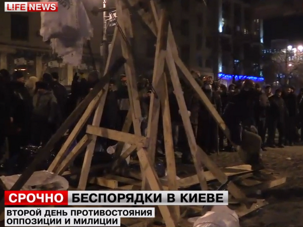 Катапульта, сооруженная из досок и железных труб, была разрушена в ходе наступления на демонстрантов, предпринятого бойцами спецподразделения МВД «Беркут» и военнослужащими внутренних войск в ночь на вторник.