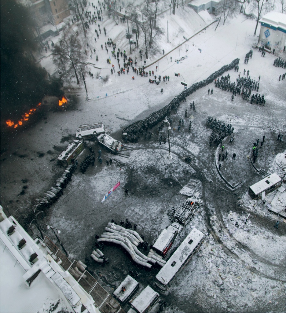 Киев, ул. Грушевского стала эпицентром столкновений между манифестантами и силами правопорядка. За спинами милиции — кабинет министров, за демонстрантами — Майдан. 20–23 января 2014 г.