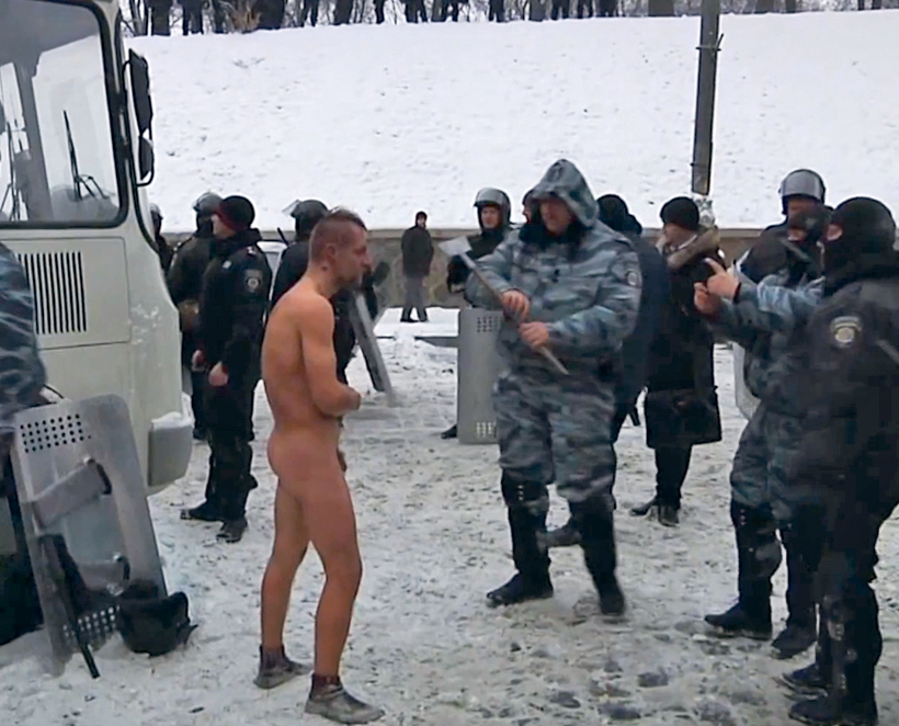 23 января задержанного возле ул. Грушевского Михаила Гавриляка спецназовцы из Новых Петровцев заставили раздеться догола при температуре -80, а «беркут» из Херсона Дмитрий Усатов забавы ради снял это на видео. Спецподразделение МВД Украины «Беркут» основано в 1992, численность — около 3 тыс. чел. Минимальная зарплата — 4 тыс. гривен (16,3 тыс. руб.) при минимальной по МВД — 1,8–2 тыс. гривен.