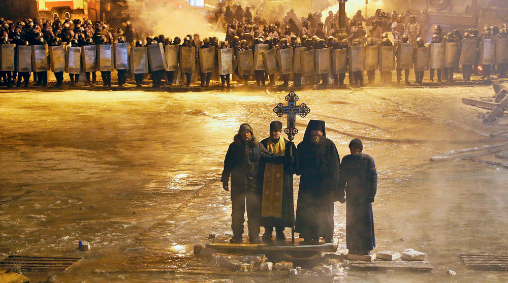 Священники часто вставали между протестующими и милицией, пытаясь предотвратить кровопролитие. Киев, ул. Грушевского, 23 января 2014 г.