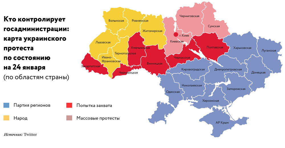 Протесты захлестнули и регионы. Сотни активистов во Львове, Луцке, Одессе и Чернигове несколько дней держат взаперти подразделения силовиков, мешая им выехать в Киев. «Они и сами не хотят никуда ехать. Поэтому не особо сопротивляются», — пояснил The New Times 42-летний одесский предприниматель Борис. Две тысячи активистов во Львове в четверг, 23 января, захватили здание областной администрации, объявив, что «берут власть в свои руки». Губернатор Олег Сало тут же сложил полномочия (чуть позже он, правда, попросил считать недействительным свое заявление об увольнении). Директор фонда «Демократические инициативы» Ирина Бекешкина не исключает, что в случае попыток силового подавления протеста в стране начнется партизанская война. Эксперт ссылается на данные «Центра Разумкова», согласно которым в акциях против власти уже приняли участие 26% жителей западных регионов страны, 15% — в центральных областях, 5,5% — на юге и 3% — на востоке. При этом в Киеве так или иначе протестам помогали 39% горожан.