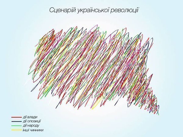 Но сначала фотография в заголовке: автор схемы неизвестен, она обнаружена в фб, причем явно была элементом длинной цепочки перепостов. Перевод того, что в левом нижнем углу: действия власти, действия оппозиции, действия народа, иные факторы.
