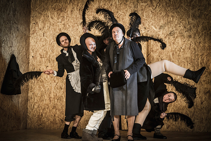 Родство двух опусов интересно еще и тем, что интонационно и жанрово они отличаются друг от друга едва ли не диаметрально: если «Киже» был одним из самых суггестивных серебренниковских сочинений (именно трудно перевариваемая столичным зрителем суггестия в конце концов и решила судьбу этой незаслуженно быстро снятой с репертуара постановки), то «Мертвые души», напротив, прикидываются демократичнейшим зрительским спектаклем редкой даже для раблезианца Серебренникова игровой энергии, витальность которой усилена легким гомоэротическим флером (в московской версии спектакля, как и в рижской, всех гоголевских героев — включая Коробочку и помещичьих жен — играют актеры-мужчины). Спектаклю в премьерной его кондиции определенно показана усушка и утруска: совладать с напором этого щедро нашпигованного гэгами действа, не сбавляющего скоростей два с половиной часа без антракта, пока что тяжело не только публике, но и актерам — но даже при наличии изрядных длиннот «Мертвые души» уже сегодня смотрятся совершеннейшим зрительским хитом. Угождая пристрастиям столичных актеров с их извечной тягой к бенефисности, репризности и эстрадности (путешествие из Риги в Москву сделало эти качества «Мертвых душ» еще более явными), Серебренникову между тем вполне виртуозно удается вписать их в жесткий режиссерский рисунок — работая вроде бы на территории чистого мейнстрима, режиссер вчитывает в эффектную (местами даже слишком) форму сложносочиненное театральное содержание.