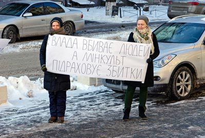 © «Влада вбиває людей, а Мінкульт підраховує збитки» / Facebook В среду, 29 января, у здания министерства культуры Украины художники провели акцию протеста против его позиции по отношению к событиям на Майдане.