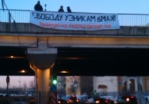 В четверг на эстакаде Садового кольца над Цветным бульваром активисты вывесили баннер с агитацией к шествию в поддержку "болотных узников", которое намечено на 2 февраля. Об этом сообщает корреспондент "Граней". Надпись на баннере гласит: "Свободу узникам 6 мая! Выйди на марш 02.02.14".