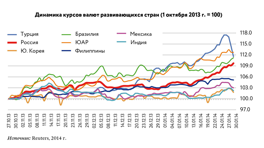 Все ждали решения ФРС. Оно соответствовало ожиданиям рынка: программу выкупа облигаций сократили на $10 млрд, до $65 млрд ежемесячно. Но это решение генерировало дальнейшее сильное давление на валюты развивающихся стран, в том числе и на рубль. Тем не менее я ожидаю, что обвальная девальвация рубля будет достаточно кратковременной, потому что серьезный макроэкономический фундамент под этим явлением отсутствует. Предыдущие такие эпизоды были связаны с кризисами: российским 2008-2009 года, греческим осени 2011 года, кипрским 2013 года. Сейчас же нет кризиса, который бы генерировал отток капитала из развивающихся стран. Но когда рубль пройдет точку разворота, сказать достаточно трудно.