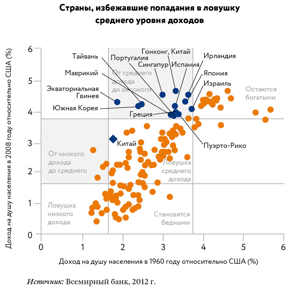 Этот термин — ловушка среднего уровня доходов — появился в экономической теории относительно недавно, в работе экономистов Всемирного банка Индермит Джилла и Хоми Хараса «Ренессанс в Юго-Восточной Азии: идеи для экономического роста». В 2012 году эксперты Всемирного банка в докладе «Китай-2030» построили ставший классическим относительно простой — но все гениальное просто — график (см. внизу страницы), который показал, что за 50 лет к 2008 году только 13 странам из 101, попавших в категорию среднего дохода в 1960 году, удалось совершить прорыв в группу стран с высоким уровнем дохода.