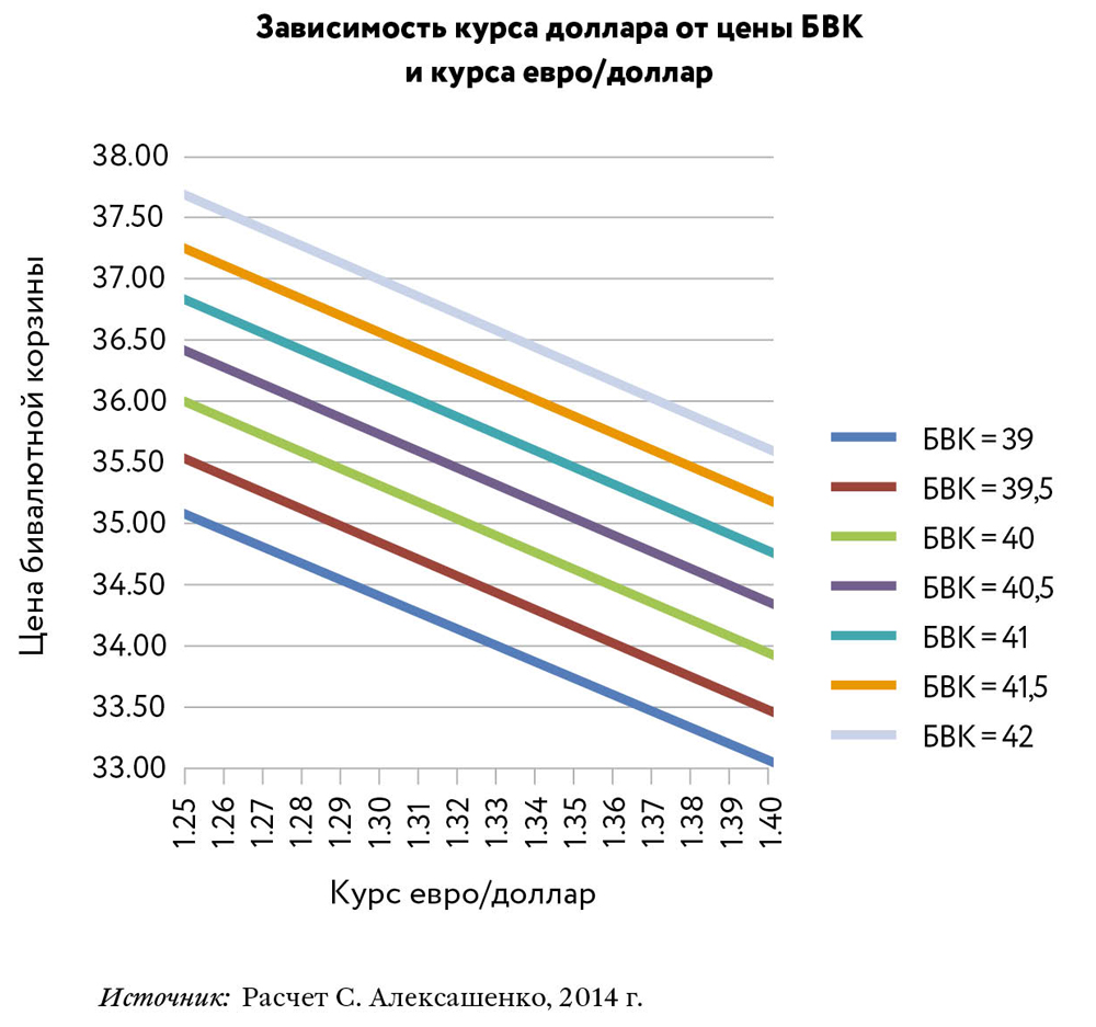 Рубль особенно сильно упал по отношению к евро. Курс европейской валюты бьет исторические рекорды, перескочив за 48 рублей, а «зеленый» стоит вполне «пристойные» 35 руб. (самым дорогим доллар был 19 февраля 2009 года — 36,43 рубля). Дело в том, что Банк России уже много лет регулирует курс рубля по отношению к так называемой «бивалютной корзине» (БВК), которая на 55% состоит из американского доллара, а на 45% — из евро. Таким образом, курс доллара в России зависит не только от «воли и желания» Центрального банка, но и еще от соотношения курса евро/доллар. Так, при цене БВК в 41 рубль и курсе евро/доллар = 1,25, $1 будет стоить 36,85 рубля, а при курсе евро/доллар = 1,4 — 34,74 рубля (см. график справа). В декабре-январе курс евро/доллар устойчиво держится на весьма высоком историческом уровне (1,35–1,38), что делает евро более дорогой валютой для россиян.