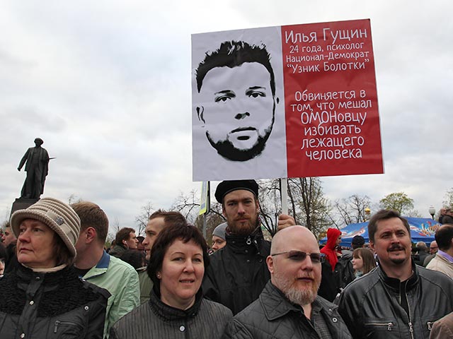 По версии следствия, во время беспорядков на Болотной 24-летний Гущин схватил за форму сотрудника полиции и пытался повалить его на землю. Молодой человек признал вину в применении силы против стража порядка, заявив, что пытался помешать тому избить другого демонстранта, однако свое участие в массовых беспорядках Гущин отрицает.