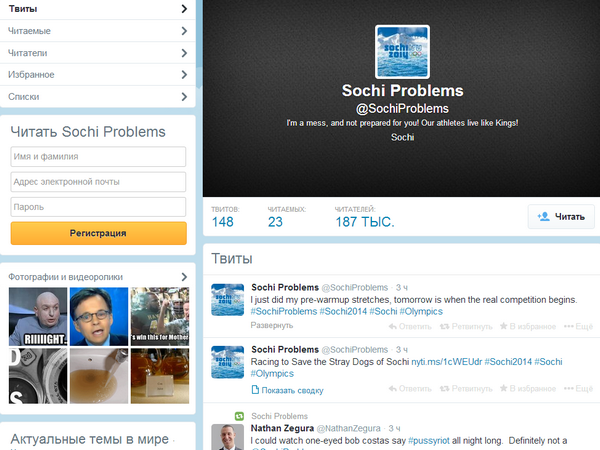 Твиттер, посвященный проблемам, с которыми столкнулись спортсмены и гости Олимпиады в Сочи, как, например, ржавая вода в гостинице или наличие двух унитазов в одной кабинке, перегнал по популярности официальный твиттер Игр-2014.