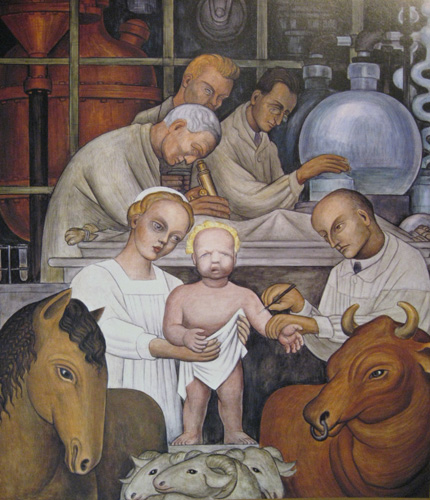 Диего Ривера. «Вакцинация». Фрагмент фрески «Индустрия Детройта» Сразу после выставки в МоМА Диего Ривера отправляется в Детройт по личному приглашению Эдселя Форда, сына Генри Форда. В индустриальном центре Америки художник получает заказ на фреску в центральном дворе Института искусств на тему «Промышленность Детройта», за работу над которой Ривера берется с удовольствием и чрезвычайным интересом: он изучает технологию на местных заводах, устройство современных конвейеров, станков и гигантского машиностроительного оборудования. Любопытно, что Генри Форд к началу 1930-х годов обладал репутацией бескомпромиссного антикоммуниста. В период с 1929 по 1930 год с завода Форда были уволены тысячи рабочих. Ривера прибыл в Детройт спустя неделю после очередного крупного скандала с забастовщиками. И, несмотря на это, художник, который ярко заявляет о своей позиции борца за права пролетариата, принимает заказ и деньги от промышленного магната. Проект в Детройте оказался непростым: фрагмент фрески с сюжетом «Вакцинации» вызвал аллюзии на традиционную иконографию Рождества Христова, что спровоцировало настоящую бурю протеста — в прессе и в церквях — против мурали. Несмотря на все нападки, в первый день готовую фреску пришло посмотреть около 10 тысяч человек. Широкий общественный резонанс стал частью самого произведения и принес городу славу. События в Детройте можно считать репетицией генерального сражения. Настоящую схватку за сохранение своей работы и право на свободу высказывания Ривере еще предстояло пережить. Следующим крупным проектом художника в США стало оформление главного вестибюля центрального здания Рокфеллеровского комплекса в Нью-Йорке.