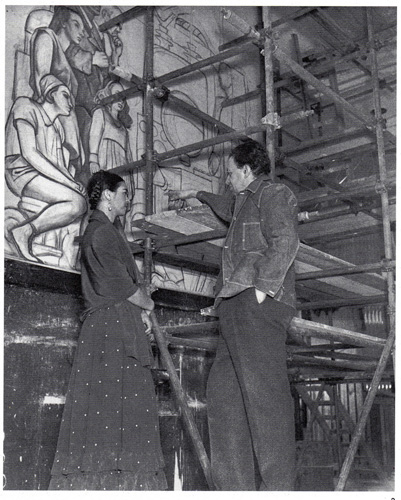 Диего Ривера и Фрида Кало в холле Рокфеллеровского центра. 1933 В начале 1930-х годов Диего Ривера был безусловным лидером поколения мексиканских монументалистов, одним из самых известных и противоречивых художников в мире. Его открытые политические симпатии к коммунизму, блистательные монументальные фрески, насыщенная творческая и социально-политическая жизнь создали образ гения — создателя нового искусства ХХ века, что привлекло к нему внимание широкой иностранной аудитории.