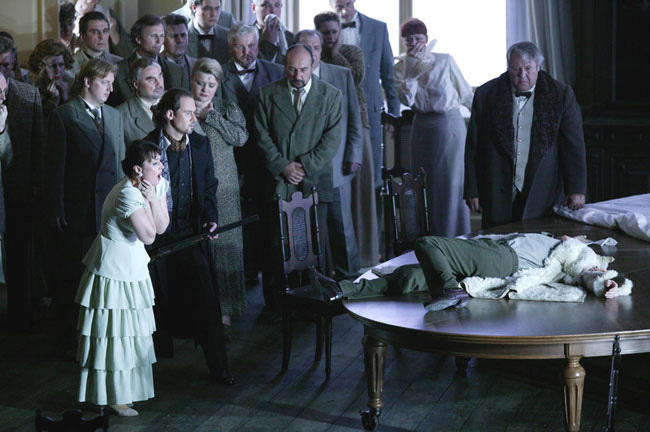 © Дамир Юсупов / Большой театр Сцена из спектакля «Евгений Онегин» Из бездонных репертуарных недр Мариинки, где ничего не выкидывается и где по-прежнему числятся три черняковских спектакля — «Китеж», «Жизнь за царя» и «Тристан», — вдруг раз в год-два, как мертвец из гроба, встает то один, то другой. Но даже страшно представить, в каком состоянии! Монтировщики не помнят, откуда какая деталь декораций, а хор — из какой кулисы выходить. Это уже не спектакли и даже не воспоминания о них.