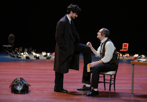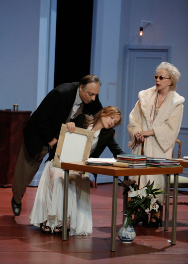 © Pascal Victor Если попытаться описать игру Юппер одним словом, то это слово будет «скерцо». Вихревой внутренний темп, виртуозные перепады ритма — и ни единого, за два с лишним часа в главной роли, «жирного» акцента; Юппер играет Мариво, как Марта Аргерих — Шопена. И это именно Мариво, тут не спутаешь: это его союз и борьба человека с им же избранной маской, его неизбывно горькое торжество любви и тупой беспросветный страх отказа от нее, его запойный азарт маскарада и визг сорванных тормозных колодок души при перемене участи. На общем фоне спектакля игра Юппер порой кажется почти избыточной — но это не напор проживания, не мощь выразительности: это интенсивность связности существования, обеспечивающая иллюзию легкости движения по линии роли. Благодаря плохой режиссуре Бонди Юппер временами приобнажает механику своего мастерства: как почти любая великая актриса, она нуждается в умном авторе, и потому в начале спектакля, когда Араминта еще не вовлечена в круговерть сюжета, — до той самой секунды, когда Дюбуа говорит ей, что Дорант любит ее, — Юппер работает словно вхолостую, придумывая себе второй план как бы заранее, играя Мариво там, где Мариво для ее героини еще не начался, на чистой технике, из ниоткуда, без мотивировок, складывая ритм жестов и реакций.