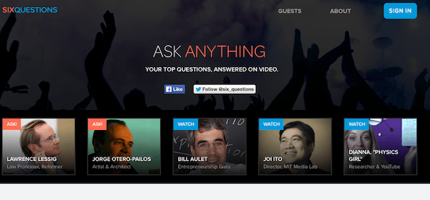 Веб-сайт, который позволяет пользователям предлагать и голосовать за вопросы, которые потом будут заданы знаменитостям, блоггерам или известным спортсменам. Они, в свою очередь, ответят на лучшие вопросы в коротких видео.