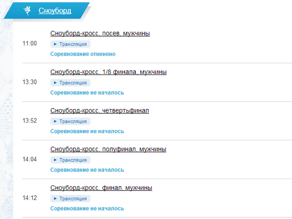 Первый квалификационный заезд должен был начаться в 11:00. Сначала сообщалось, что старт перенесен на 12:15, но через некоторое время в расписании соревнований появилась информация об отмене заезда.
