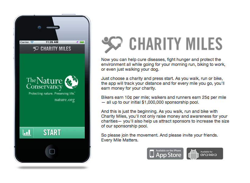 C приложением Charity Miles каждая преодоленная вами миля − это не только заряд бодрости, но и деньги, поступающие на счет выбранной некоммерческой организации. Деньги можно зарабатывать бегом или на велосипеде − приложение подсчитает расстояние и перечислит средства от спонсоров.