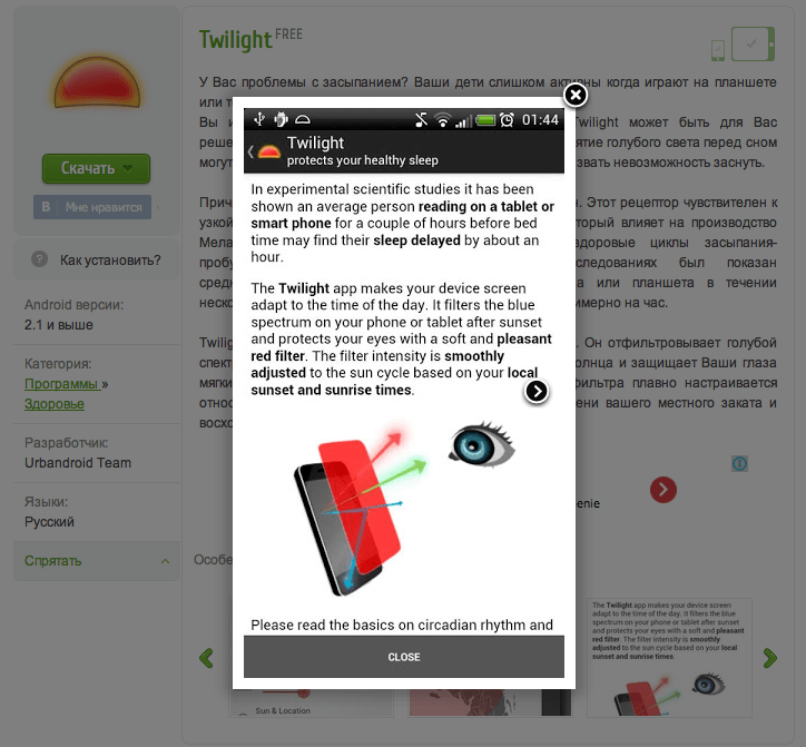 Как часто вы не могли заснуть после долгого использования телефона или планшета? Причина бессонницы в голубом свете, который способен расстроить природные ритмы. Приложение «Twilight» адаптирует экран вашего устройства под время суток, отфильтровывая голубой спектр и защищая глаза приятным и мягким красным фильтром.