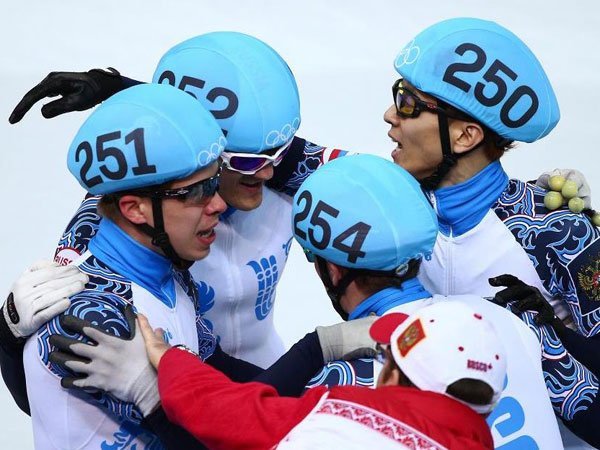 Российские бегуны Виктор Ан, Семен Елистратов, Владимир Григорьев и Руслан Захаров выиграли золото в эстафете шорт-трека на 5000 метров.