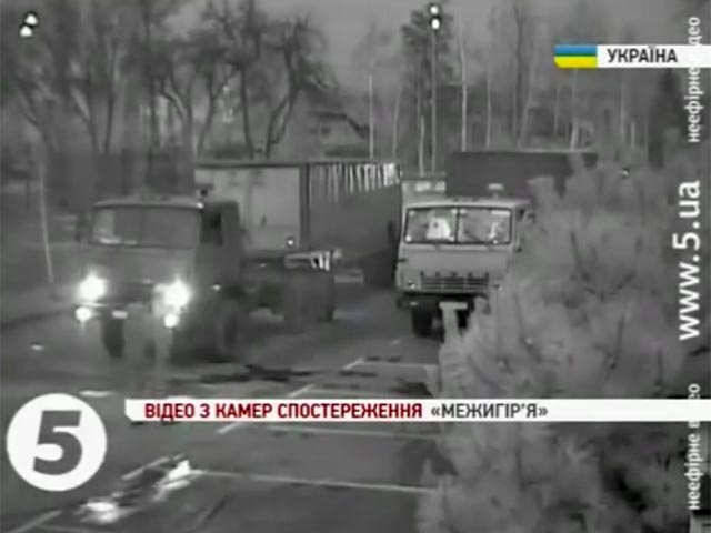 Запись камер наблюдения была опубликована "5 каналом" украинского телевидения. На кадрах видно, как от входа отъезжают грузовые автомобили и иномарки. Также видно, как часть вещей загружают в вертолеты, на которых улетает группа людей. В кадре - минимум пять грузовых машин, два вертолета и пара внедорожников.
