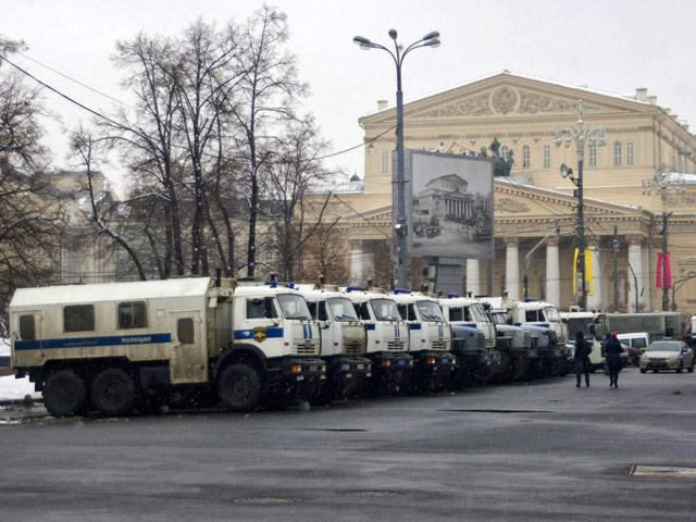 По некоторым данным, близ Манежной площади размещены 32 военных грузовика.