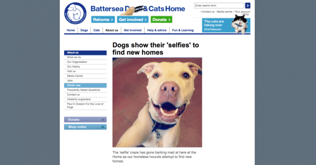 Battersea shares dog selfies − проект с собачьими «селфи» − автопортретами собак, которые ищут новый дом. Автопортреты являются очень популярным жанром, и подобные фотографии, необычные ввиду того, кто именно позирует, могут привлечь внимание потенциальных хозяев и дать собакам второй шанс.