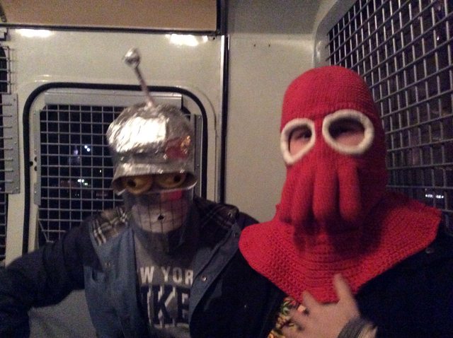 ОМОНовцы поделились с нами своим авторитетным мнением о том, что маски в общественных местах носить совершенно и никак нельзя, после чего сделали нам предложение, от которого мы не могли отказаться — бесплатно прокатиться в автозаке до ОВД с целью дачи объяснений по поводу непоймичего. Пост в Твиттер «Зойдберг в автозаке» был отправлен мною в 19:26; по протоколу я был задержан в 20:20, что говорит нам о том, что время в автозаке идёт по отличным от земных законам. Некоторое время мы поотмораживались в автозаке втроём; потом к нам подселили ещё одного товарища и собрались, было, везти в ОВД «Тверское»; но там, видимо, берегли место для Навального и, прости господи, Pussy Riot; поэтому нас четверых привезли к