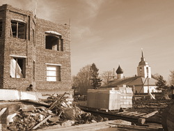 Коттеджный посёлок Петропавловский состоит из 1-2-этажных домов, причем высотность строений снижается по мере приближения к памятнику архитектуры. Новый собственник дома №1 (спаренное строение с домом №3, как уточнили редакции соседи), видимо, решил расширить свои жилые площади: разрушил свою покупку и начал новое строительство, по габаритам раза в три превышающее параметры оригинального архитектурного проекта.
