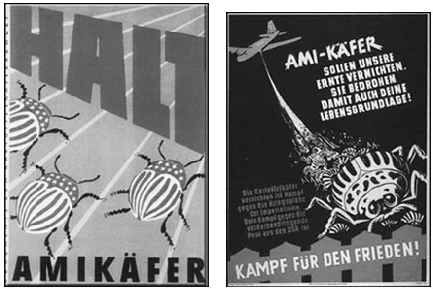 Колорадский жук на плакатах ГДР 1950-х годов Если в СССР эти подозрения чаще всего циркулировали как слухи, то в ГДР в 1950 годы обвинения агротерроризме в адрес США звучали вполне официально. Они отражены и в восточногерманских плакатах тех времен. Восточные немцы даже прозвали колорадского жука Amikäfer, соединив слова Amerikanischer «американец» и Käfer «жук». Аналогичные заявления в 1950-е годы делали правительства Польши и Чехословакии. Неоднократно обвинения звучали и со стороны кубинских властей, утверждавших, что американцы забрасывают на остров вредителей сахарного тростника. Но документальных подтверждений все эти подозрения так пока не получили.
