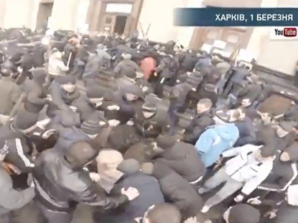 Антимайдан в Харькове атакует областную госадминистрацию 1 марта президент России Владимир Путин обратился к Совету Федерации за разрешением использовать вооруженные силы на территории Украины. Совфед провел внеочередное заседание, и сенаторы единодушно разрешение дали. В качестве повода было использовано обращение нового премьер-министра Крыма Сергея Аксенова к президенту России. Аксенов призвал «оказать содействие в обеспечении мира и спокойствия на территории автономной республики». Свою просьбу он объяснил тем, что в Крыму находятся неопознанные вооруженные формирования, а подчиняющиеся Киеву силовые структуры неспособны эффективно контролировать ситуацию. Позднее пресс-секретарь главы государства Дмитрий Песков сообщил, что президент пока не принял решений о направлении российского контингента на Украину.