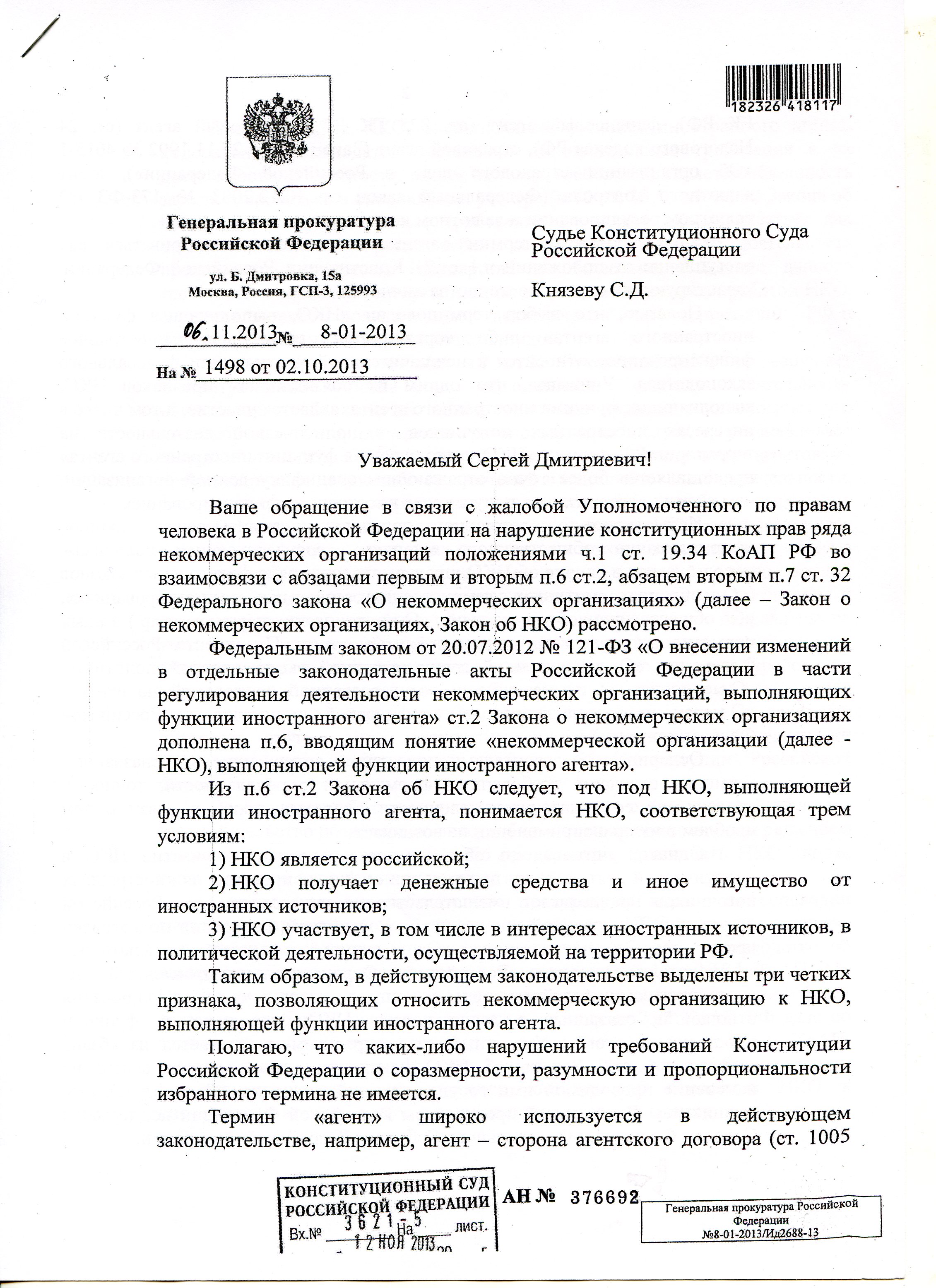 А заместитель генерального прокурора Сабир Кехлеров не видит ничего плохого в термине "иностранный агент", этот термин, "широко используется в действующем законодательстве, например, агент – сторона агентского договора, финансовый агент, налоговый агент, страховой агент, агент валютного контроля. Таким образом, термин "агент" не может рассматриваться как отступление от положений ч.1 статьи 21 Конституции РФ, гарантирующих охрану достоинства личности".